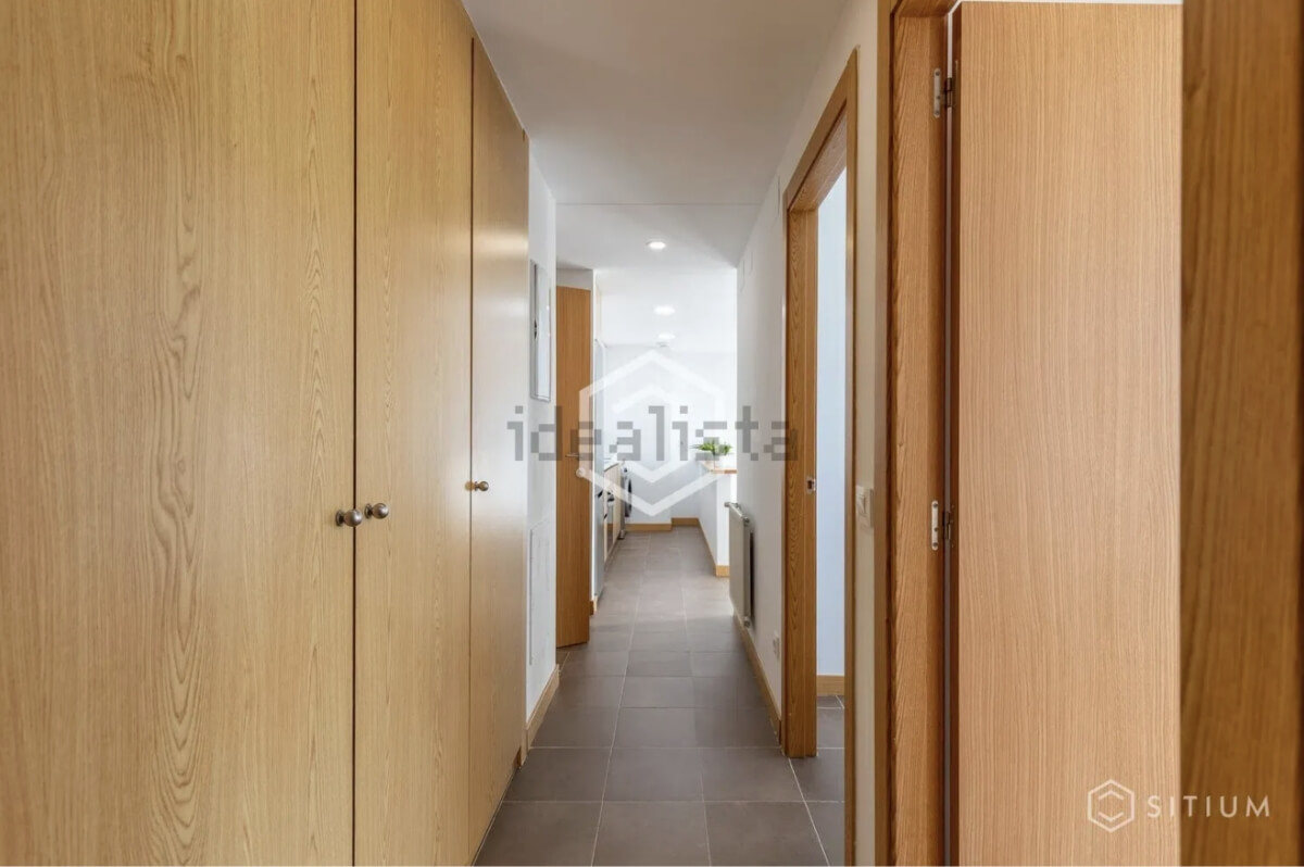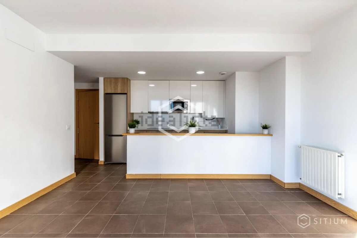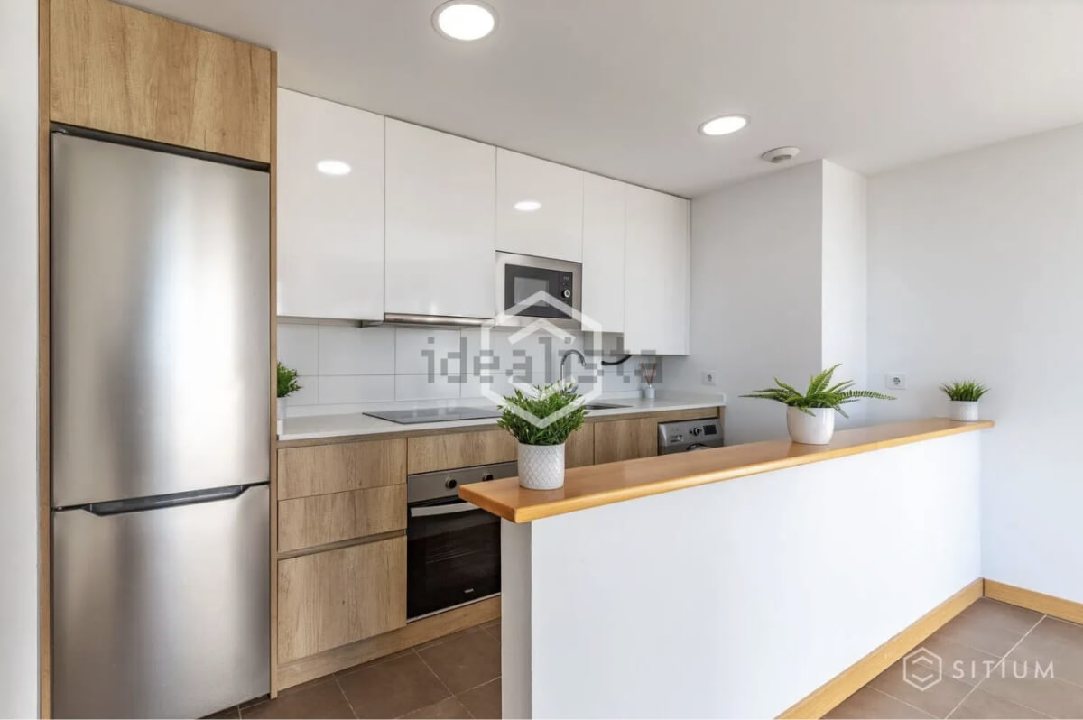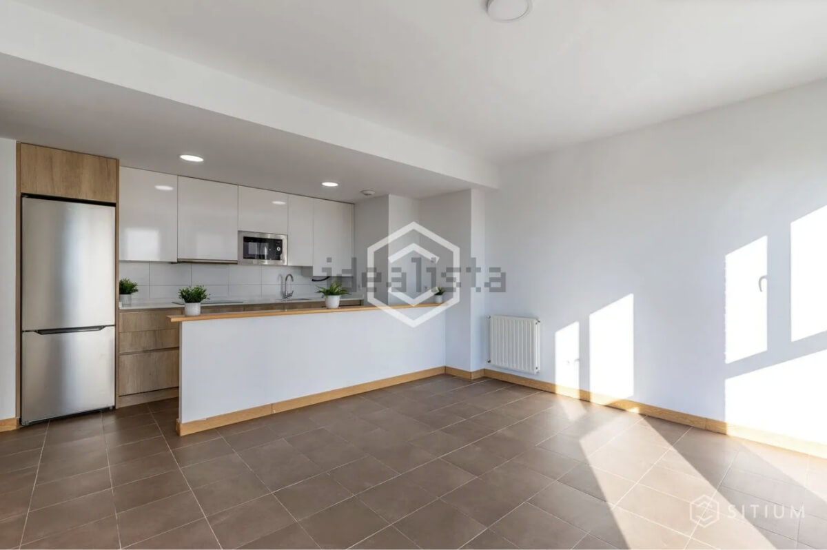 La vivienda, con 70 m2 útiles, cuenta con una distribución práctica. Dispone de un salón con cocina integrada, totalmente equipada con electrodomésticos actuales. Tiene dos habitaciones amplias, una de ellas con armario empotrado y un baño completo con plato de ducha, también cuenta con un gran armario empotrado en el pasillo. Todas las estancias son exteriores y gozan de orientación sur, con grandes ventanales hasta el suelo, lo que permite disfrutar de luz natural durante todo el día, especialmente por la tarde.